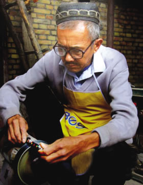 我們在另一條偏僻的小巷里,見到了“塔石罕”最小的兒子艾合買提·塔石,他今年48歲,從18歲開始學(xué)藝。由于父親的威望,來拜訪他或買小刀的人很多。我們來到他家時(shí),他正在院中制作小刀,面前擺放著小榔頭、銼、鉆、錐、老虎鉗、砂輪、砂紙等工具,還有一些正等待加工的刀胚。他告訴我們,做小刀的工藝很復(fù)雜,要將挑選出的好鋼好鐵進(jìn)行鍛打、沾火、造型、銼磨、鑲嵌銅、骨、花紋等一系列的工藝,一把好刀要四五天才能做好。我們發(fā)現(xiàn),他制作的小刀柄部均以孔雀頭為造型,上有孔雀羽毛的圖案,看上去華麗而高檔,令人愛不釋手。艾合買提·塔石給我們展示了他的不少“作品”,長短不一,最長的一把折刀拉出刀子有40厘米,明晃晃的,非常漂亮。這種刀是宰羊、殺瓜絕好的工具。艾合買提·塔石在他做的刀子上打印了“5”的字樣,謹(jǐn)防假冒,同時(shí)也是質(zhì)量保證的標(biāo)記。