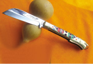 我們有幸在這街上見到了“塔石罕”的徒弟羅赫曼·芒蘇爾,他的小刀注冊了商標(biāo)并在自治區(qū)獲過獎(jiǎng)。在他的貨架上,我們見到了幾乎包括了各種類型的沙雅小刀,長度從15厘米到3厘米,五顏六色,令人眼花繚亂。如今小刀的制作技藝比過去有了進(jìn)一步的提高,有的柄部還鑲嵌了銅、銀、牦牛、鹿角、山羊角、駱駝骨、玻璃鋼、寶石和有色塑料等,圖案更加豐富,做工更加講究。今年38歲的羅赫曼·芒蘇爾11歲開始學(xué)藝,他善于經(jīng)營,如今有了小汽車,一個(gè)電話,就可以把小刀送到客戶的手里。