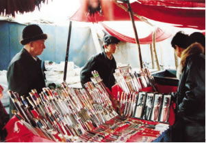 新疆出小刀的地方很多,其中有英吉沙小刀、莎車買買提折刀、伊犁沙木薩克折刀、和田墨玉奎雅折刀等。維吾爾族做刀的歷史悠久,由于工藝精湛,成為新疆的名牌產(chǎn)品。在眾多的小刀中,沙雅小刀以小巧玲瓏、裝飾精美而獨(dú)樹一幟。我們在這條街上欣賞到的小刀普遍只有一支香煙那么長(8-9厘米),最小的只有3厘米,如同絕美的藝術(shù)品,叫人愛不釋手。