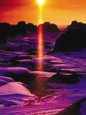 戈壁上沒(méi)有高大的樹(shù)木可以乘涼,沒(méi)有飯菜可供充饑,更沒(méi)有水源能夠解渴,唐軍一時(shí)間陷入了絕境。正在此時(shí)突然發(fā)現(xiàn)前方有一潭碧水,湖邊楊柳搖曳,屋舍成排,將軍和士兵便拼命地朝著湖水奔跑而去??墒撬麄兣艿迷娇焖簿瓦h(yuǎn)去得越快,湖水瞬間消失了,面前仍舊是熾熱的戈壁,將士們正在悲痛,突然前方又出現(xiàn)了一潭湖水,鱗波蕩漾,將士們?cè)俣瓤癖肌?br />