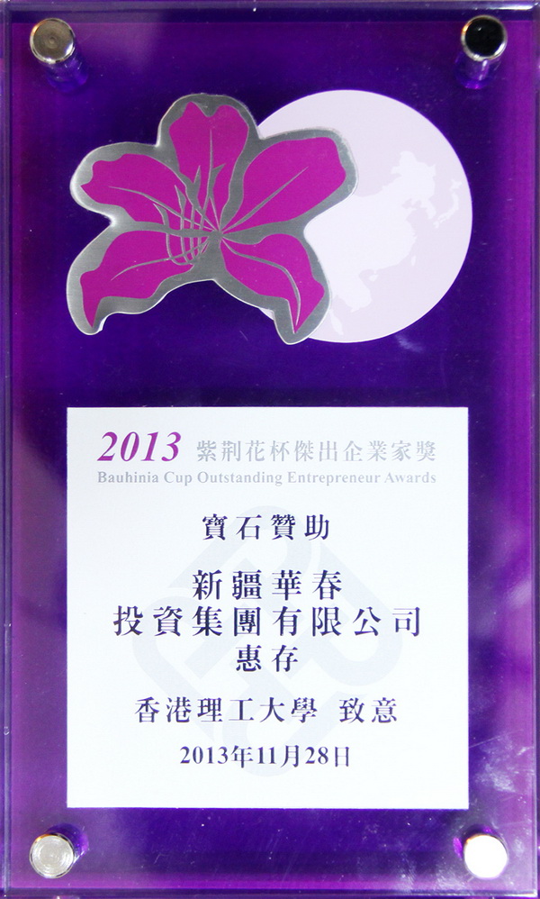 于前不久由紫荊花杯杰出企業(yè)家協(xié)會舉辦的“紫荊花杯杰出企業(yè)家” 盛大頒獎典禮儀式上,新疆華春投資集團總裁、紫荊花杯杰出企業(yè)家協(xié)會副理事長李成功先生和華春董事王春容女士,為樹立表彰對中國工商業(yè)及科技發(fā)展和社會進步作出積極貢獻的優(yōu)秀民營企業(yè)家先進典型、促進中國非公有制經濟健康發(fā)展,鼎力贊助,榮獲“寶石贊助”獎。