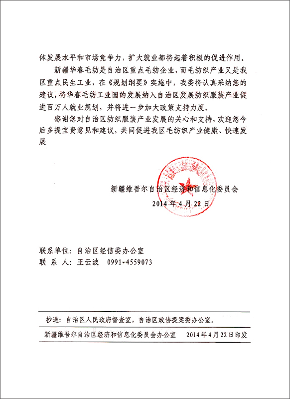 自治區(qū)經(jīng)信委在4月22日印發(fā)的新經(jīng)信辦字(2014)160號文件對自治區(qū)十一屆政協(xié)二次會議第124號提案的答復(fù)中,已明確了將華春毛紡工業(yè)園的發(fā)展納入自治區(qū)發(fā)展紡織服裝產(chǎn)業(yè)促進(jìn)百萬人就業(yè)計劃,并將進(jìn)一步加大就業(yè)政策支持力度。