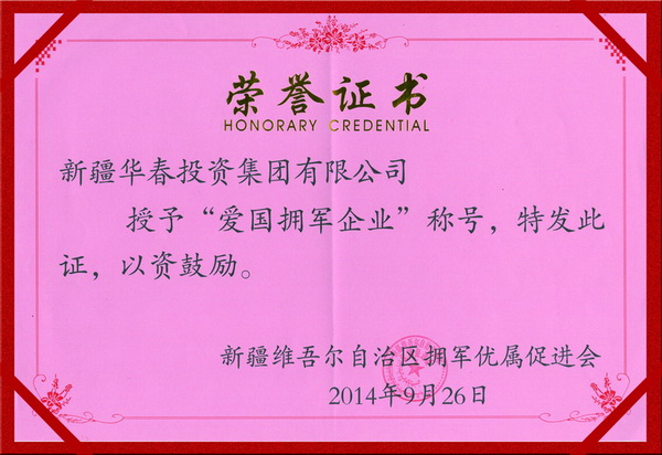華春集團以科學發(fā)展觀為統(tǒng)領,在抓好企業(yè)經(jīng)營的同時,積極維護國家安全和發(fā)展需要,舉辦多種愛國擁軍活動,著力抓好軍民共建,共創(chuàng)新疆安定團結環(huán)境。體現(xiàn)了新時期、新階段非公企業(yè)和非公經(jīng)濟人士愛國擁軍的精神,為擁軍優(yōu)屬工作和增進軍民團結,做出了重要貢獻,是具有時代特色的愛國擁軍的先進典型。