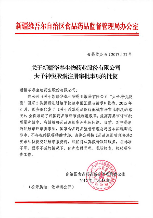 由新疆華春藥業(yè)十多年來,與清華大學(xué)生命科學(xué)學(xué)院共同研發(fā)的抗抑郁癥新藥——太子神悅膠囊, 取得重大科研成果, 獲國家專利,Ⅲ期臨床已圓滿結(jié)束。被定為國家科技部重點科技創(chuàng)新項目、科技援疆重點項目,是治療輕、中度抑郁癥的純中藥五類新藥,目前已進(jìn)入新藥的注冊階段。