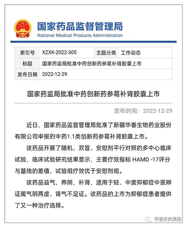 2022年12月29日,這是全疆全國醫(yī)藥界值得慶賀的重大喜慶日子!新疆華春生物藥業(yè)股份有限公司(以下簡(jiǎn)稱:華春藥業(yè))向國家藥監(jiān)局申報(bào)的國家十三五“國家重大新藥創(chuàng)制·科技重大專項(xiàng)”抗抑郁癥 1.1類中藥創(chuàng)新藥“參葛補(bǔ)腎膠囊”獲批上市!這是全國醫(yī)藥界可喜可賀的盛事!更是新疆醫(yī)藥界國家1類創(chuàng)新藥!開創(chuàng)了新疆擁有國家1類創(chuàng)新藥的新紀(jì)元!