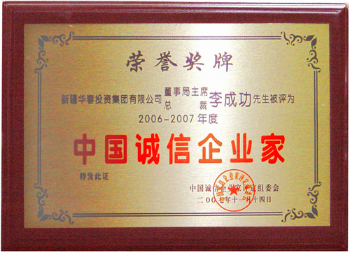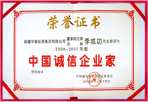 新疆華春集團總裁李成功先生經(jīng)中國誠信企業(yè)家評定組委會的初審、復審及公示,被評為2006-2007年度中國誠信企業(yè)家,于2008年剛剛開啟之際,為李成功先生頒發(fā)了榮譽證書和獎牌。