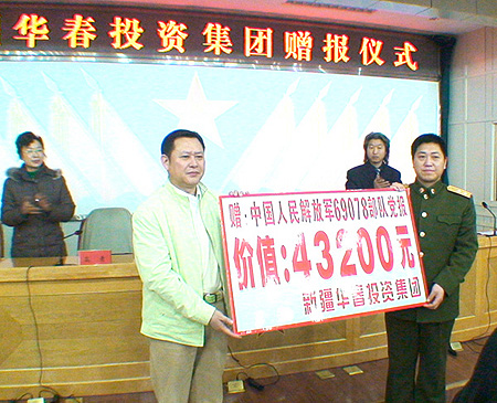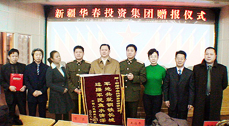 在數(shù)九寒天的1月11日,新疆華春投資集團(tuán)有限公司為了能讓69078部隊(duì)的廣大官兵及時(shí)了解國內(nèi)外各個(gè)方面重大經(jīng)濟(jì)信息、學(xué)習(xí)掌握新疆市場經(jīng)濟(jì)動(dòng)態(tài),以便能在今后市場經(jīng)濟(jì)的大潮中游刃有余,新疆華春投資集團(tuán)出資現(xiàn)金43200元,訂購150份2008年全年度的《新疆經(jīng)濟(jì)報(bào)》,贈(zèng)送給69078部隊(duì)的同志們,從而為新疆的軍民團(tuán)結(jié)、為駐疆部隊(duì)軍地人才的培養(yǎng),奉獻(xiàn)出新疆華春投資集團(tuán)的一片心力。