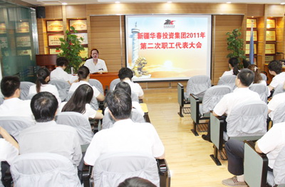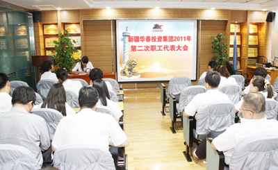 新疆華春投資集團有限公司2011年第二次職工代表大會于7月30日上午在新疆華春投資集團子公司新疆恒潤實業(yè)有限公司培訓室召開,會議由高青同志主持。參加會議的應到職工代表51人,實到職工代表 49人。
