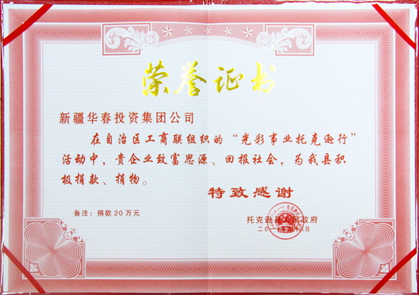 此次捐贈(zèng)款項(xiàng)用于解決托克遜縣農(nóng)牧民困難群眾生產(chǎn)資金周轉(zhuǎn)和貧困家庭子女上學(xué)等問(wèn)題。華春集團(tuán)以企業(yè)的社會(huì)責(zé)任感,歷來(lái)重視扶貧事業(yè),積極參與光彩事業(yè),回饋社會(huì),為構(gòu)建和諧新疆做出了民營(yíng)企業(yè)的一份貢獻(xiàn)。