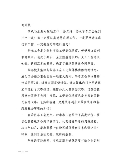 專報認為:新疆華春工會就是個例外。對內(nèi),建設(shè)規(guī)范有序、公正合理、互利共贏、和諧穩(wěn)定的社會主義新型勞動關(guān)系,促進企業(yè)發(fā)展,維護員工權(quán)益,率先簽訂工資集體協(xié)商合同,勞資雙方高度和諧,實現(xiàn)企業(yè)與員工的雙贏,被自治區(qū)黨委、政府授予“模范勞動關(guān)系和諧企業(yè)”稱號;