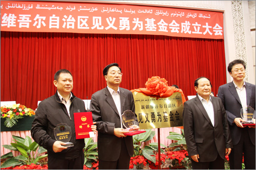 和新疆見義勇為基金會(huì)首屆理事長(zhǎng)張國(guó)梁為基金會(huì)揭牌