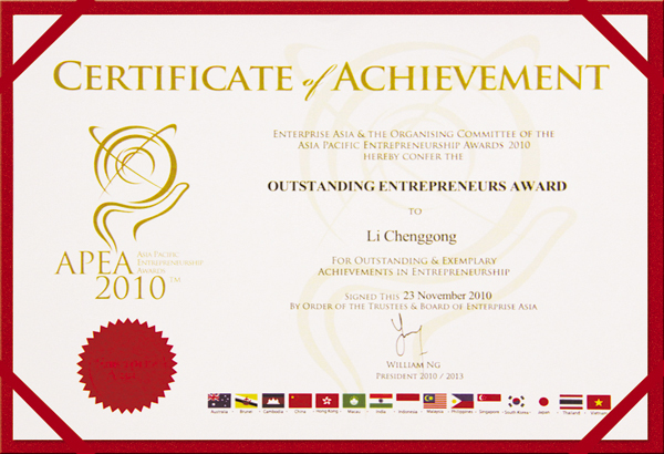 亞太企業(yè)精神獎(jiǎng)(APEA),即對(duì)亞太區(qū)域內(nèi)在建立成功企業(yè)過(guò)程中,以堅(jiān)毅精神取得卓越成就、并注重企業(yè)社會(huì)責(zé)任的企業(yè)家們給予的最高獎(jiǎng)項(xiàng)。亞太企業(yè)精神獎(jiǎng)在中國(guó)是首次進(jìn)行評(píng)選,經(jīng)過(guò)半年的時(shí)間,通過(guò)對(duì)國(guó)內(nèi)企業(yè)的層層篩選、實(shí)地考察、面對(duì)面的訪談,最終遴選出了符合APEA標(biāo)準(zhǔn)的企業(yè),經(jīng)過(guò)國(guó)際顧問(wèn)委員會(huì)的綜合評(píng)審,評(píng)選出10位企業(yè)發(fā)展良好與盡心、盡責(zé)的卓越企業(yè)家。