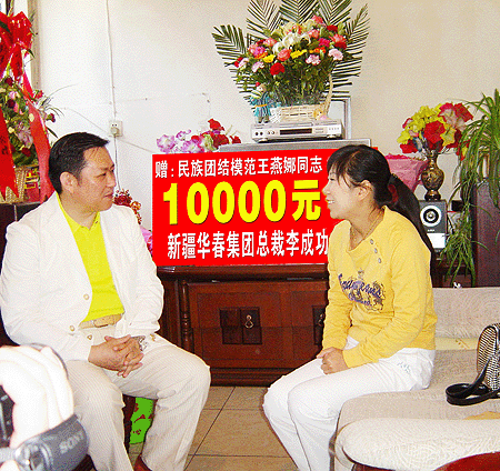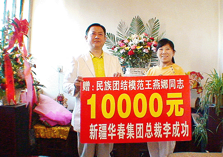 新疆華春投資集團(tuán)董事局主席兼總栽李成功給民族團(tuán)結(jié)模范王燕娜捐款1萬(wàn)元