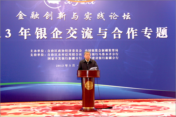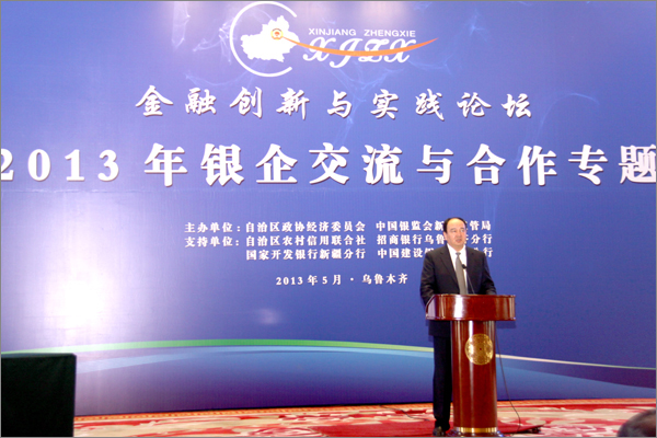 由自治區(qū)政協(xié)、中國銀監(jiān)會(huì)新疆監(jiān)管局主辦的首屆新疆金融創(chuàng)新與實(shí)踐論壇——2013年銀企交流與合作專題于5月10日在烏魯木齊昆侖賓館隆重開幕。自治區(qū)政協(xié)主席努爾蘭•阿不都滿金出席論壇并致辭,自治區(qū)副主席錢智作重要講話。自治區(qū)人大、政府、政協(xié)等領(lǐng)導(dǎo)出席論壇開幕。自治區(qū)和兵團(tuán)學(xué)者、金融專家、新疆境內(nèi)多家商業(yè)銀行、非銀行金融機(jī)構(gòu)代表,中小微企業(yè)、商會(huì)負(fù)責(zé)人等400余人齊聚一堂,20位來自政府相關(guān)部門、金融監(jiān)管和金融機(jī)構(gòu)、小微企業(yè)和非銀行金融機(jī)構(gòu)的人士作了專題發(fā)言。新疆華春集團(tuán)李成功總裁、常青副總裁2位代表做精彩演講。