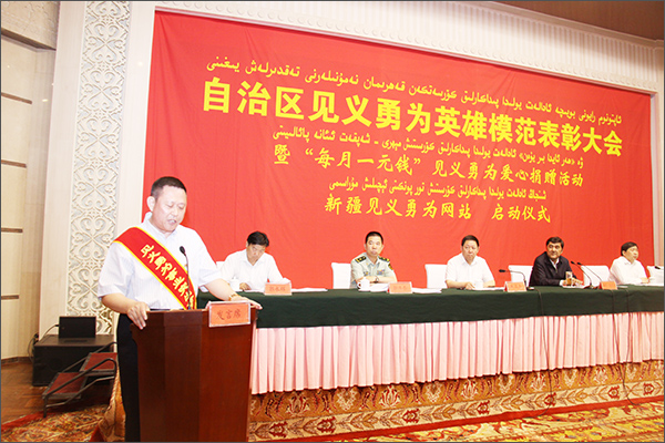 李成功總裁代表為自治區(qū)見義勇為事業(yè)作出突出貢獻的模范單位和個人在表彰大會上發(fā)言。他懷著感恩之情說:“我們只是做了一點力所能及的事,自治區(qū)人民政府給予了我們這么高的榮譽,民營企業(yè)的發(fā)展,得益于黨的好政策、得益于和諧安定的社會環(huán)境。而正是這些見義勇為的英雄們,為今天和諧安定的社會,獻出了他們的鮮血和生命,使我們企業(yè)有了優(yōu)美的發(fā)展環(huán)境,飲水思源,我們要把對見義勇為英雄們的敬仰之情,轉化為弘揚正氣、凝聚正能量、構建和諧社會的強大動力。企業(yè)要積極參與支持見義勇為事業(yè)、并回報社會,這是所有民營企業(yè)家義不容辭的社會責任!希望有更多的民營企業(yè)家和社會有識之士,以勇于擔當?shù)臅r代精神,積極投身于見義勇為事業(yè),慷慨解囊,用實際行動真誠關心、愛護見義勇為者,決不讓為社會安定、人民幸福而流血的見義勇為英雄們流血又流淚、傷身又傷心。形成全社會都來關心、支持見義勇為事業(yè)、弘揚見義勇為精神的良好局面,為新疆的跨越式發(fā)展和長治久安做出應有的貢獻!讓我們攜起手來,共同激發(fā)起全社會的正能量,弘揚正氣,為正義之火添柴加薪!