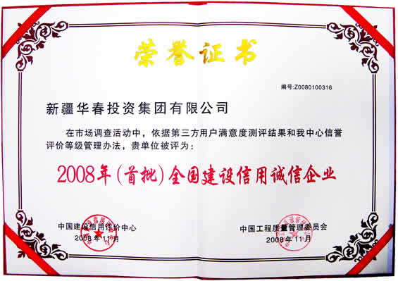 “2008年首批全國(guó)建設(shè)信用誠(chéng)信企業(yè)”榮譽(yù)證書(shū)